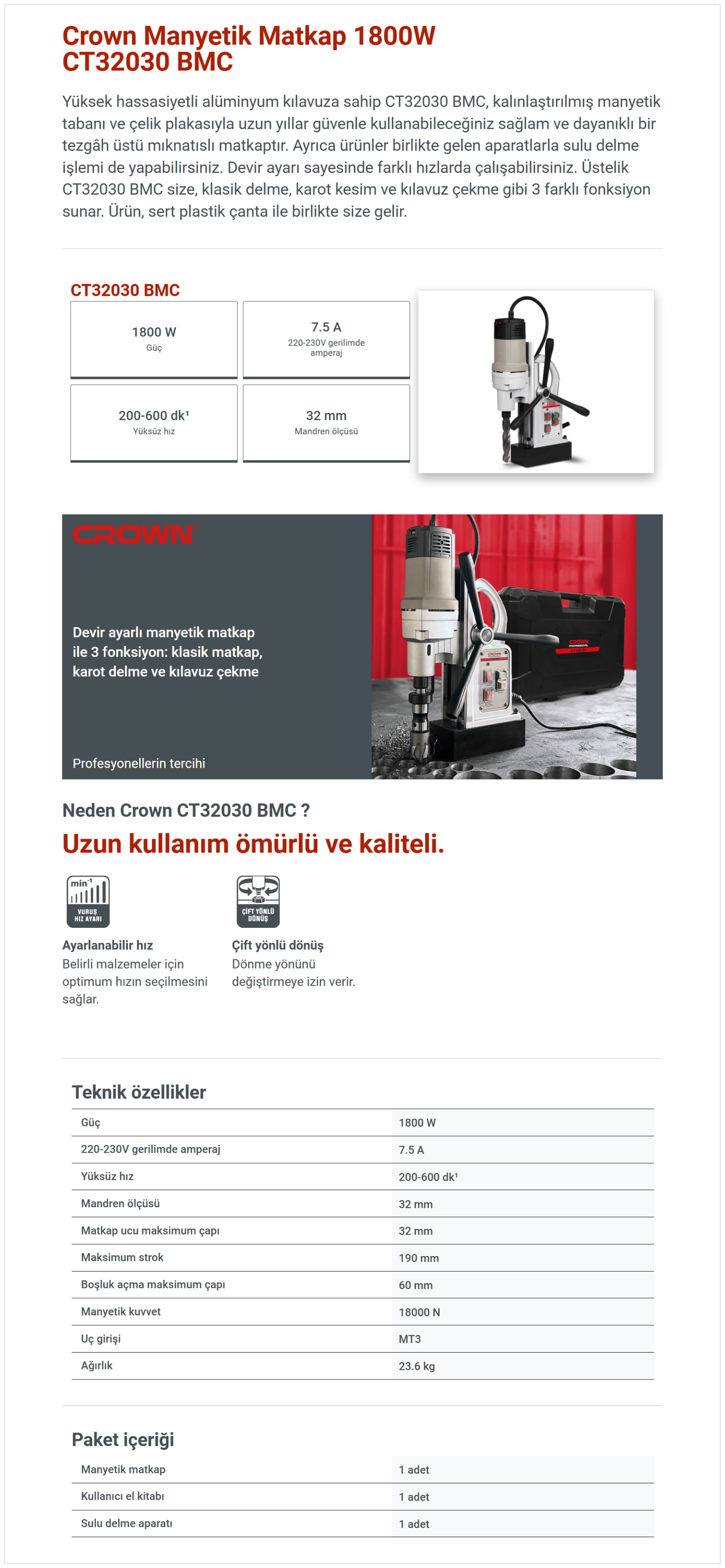 Etiketler: Crown, matkap, manyetik matkap, helezonik matkap, karot matkap, kılavuz matkap, CT32030, fiyat/performans