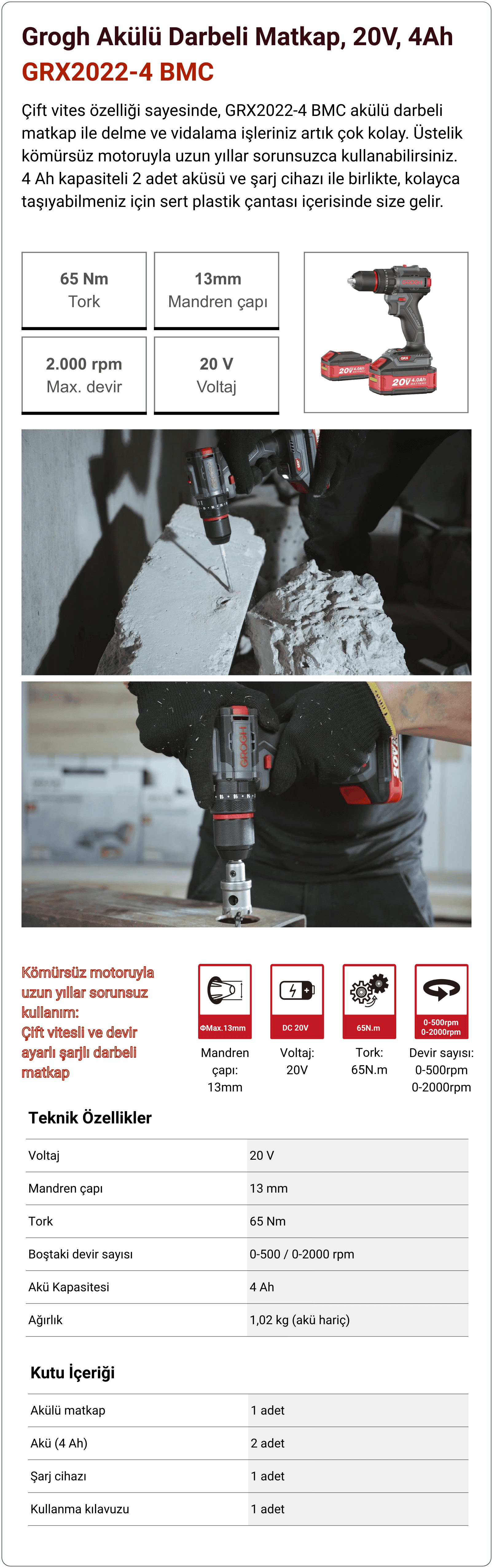 Grogh Akülü Darbeli Matkap 20V-4Ah GRX2022-4 BMC