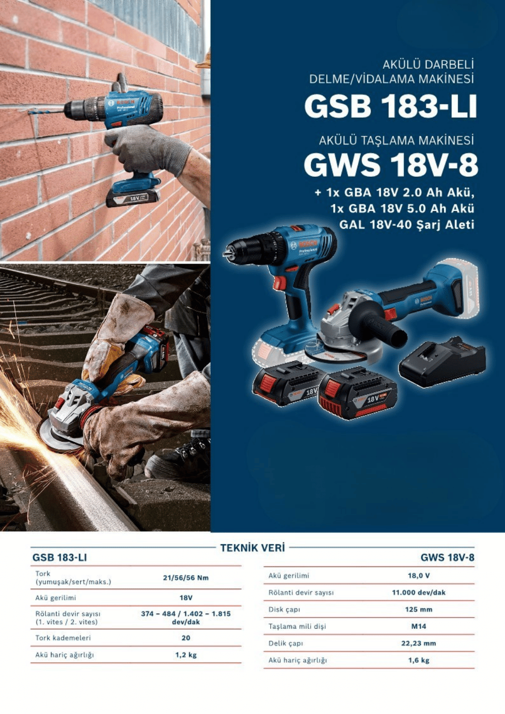 Bosch GSB 183 LI Akülü Darbeli Delme/Vidalama + GWS 18V-8 Akülü Taşlama