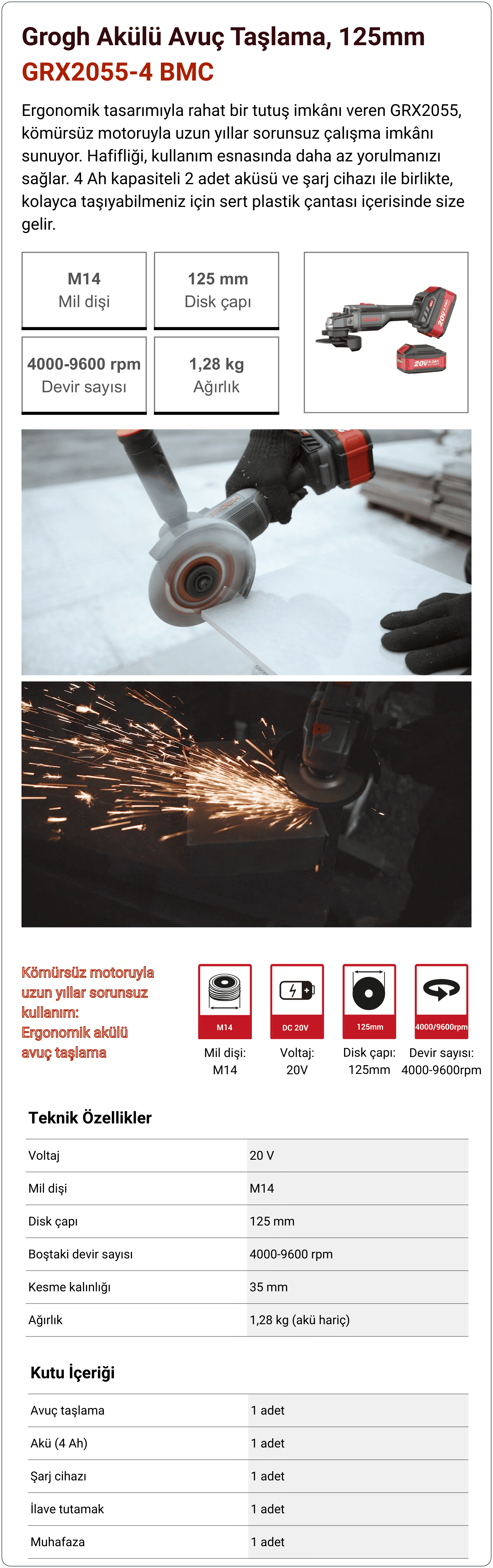 Grogh Akülü Avuç Taşlama 20V-4Ah 125mm GRX2055-4 BMC