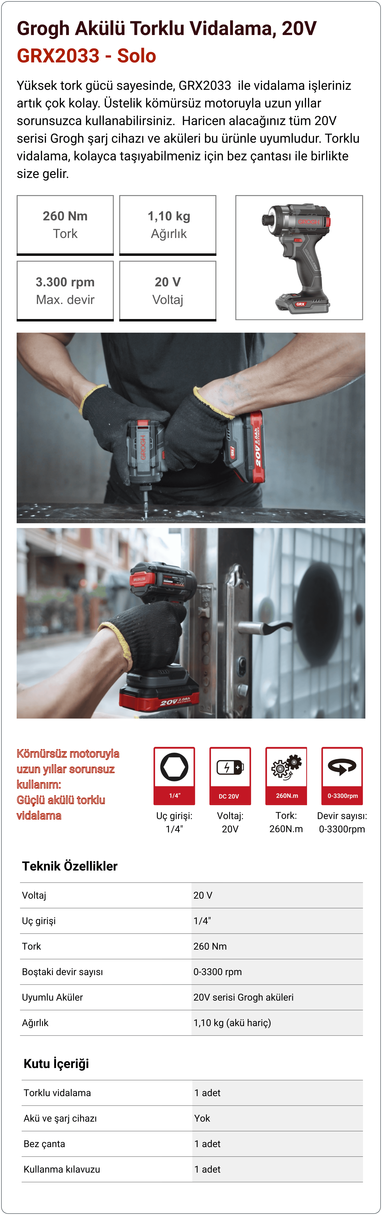 Kömürsüz motorlu Grogh GRX2033 serisi akülü torklu vidalama. En uygun fiyatlarla sahip olmak için acele edin!